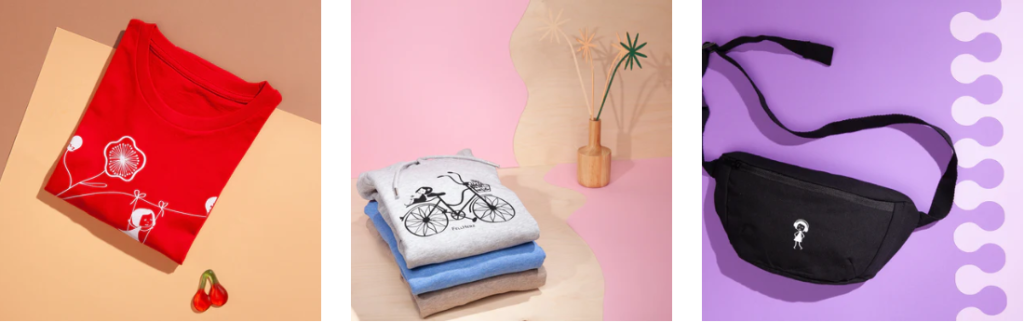 Alle Artikel bestehen aus zertifizierten Bio-Materialien (z. B. GOTS-zertifizierte Bio-Baumwolle) und werden unter fairen Bedingungen produziert. Die Drucke entstehen in kleinen Auflagen und werden in Deutschland realisiert.