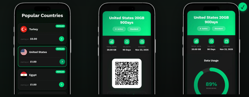 Nach dem Kauf wird die eSIM freigeschaltet und via QR-Code oder über eine App installiert. In der Benutzeroberfläche kann man aktivierte Pakete verwalten, restliches Datenvolumen einsehen und eventuell neue Pakete hinzubuchen.