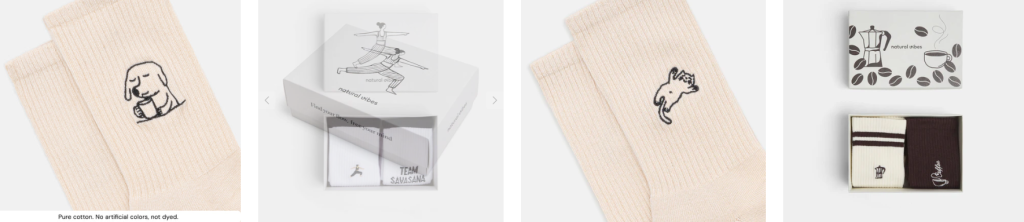 Das Herzstück des Sortiments sind Socken (Kurzsocken, Tennissocken etc.) mit kreativen Mustern, Motiven und Statements. Die Materialien sind meist organisch oder recycelt, und jedes Design wird mit Blick auf Nachhaltigkeit ausgewählt.