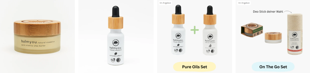 Auf der Website von balmyou.com finden Kunden ein sorgfältig ausgewähltes Sortiment an Pflegeprodukten für Gesicht, Körper und Haare. Neben der berühmten Sheabutter bietet die Marke auch kaltgepresste Öle, sanfte Seifen, Lippenpflege und natürliche Deodorants an. Alle Produkte sind vegan, tierversuchsfrei und dermatologisch getestet. Jedes Produkt folgt einem klaren Prinzip: Weniger ist mehr – nur die nötigsten Inhaltsstoffe, in bester Qualität und höchster Reinheit.