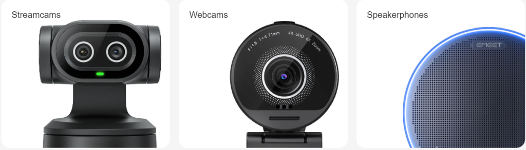 emeet.com bietet eine sorgfältig kuratierte Auswahl an Webcams, Konferenzkameras, Lautsprechern und Mikrofonlösungen. Die Produkte überzeugen durch exzellente Bild‑ und Tonqualität, einfache Bedienung und hochwertige Verarbeitung. Sie eignen sich für Home Office, Streaming und professionelle Meetingräume.