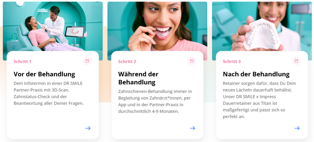 Ein weiterer Vorteil von DrSmile ist die Benutzerführung auf der Website selbst: Die Seite bietet eine klare Navigation zwischen verschiedenen Themen wie „Wie funktioniert die Therapie?“, „Kosten“, „Behandlungsdauer“ und „Partnerpraxen“. So können potenzielle Kunden bereits vor einem Beratungstermin einen guten Überblick über den Ablauf und die Leistungen gewinnen .